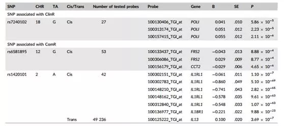 ?、?全基因組協(xié)會(GWA)的研究已經(jīng)明確與哮喘發(fā)生相關(guān)的基因,但是沒有研究哮喘緩解;② 臨床緩解(ClinR)的定義是,最近一年中沒有哮喘治療和喘息,最近3年內(nèi)無哮喘發(fā)作,完全緩解(ComR)在臨床緩解的條件基礎上,還必須保持正常肺功能和無支氣管高反應性(BHR);③ 評估了2個獨立群體(總n = 456)中25個頂端單核苷酸多態(tài)性(SNPs)的復制情況,然后對肺組織和上皮細胞中4個復制的SNP進行定量位點表達(eQTL)分析;④ 本研究確定了3個與完全哮喘緩解相關(guān)的SNP,其中2個SNP與FRS2、CCT、IL1RL1、IL18R1和IL13有生物學相關(guān)性;⑤ 本研究三個相關(guān)SNP分別為rs7240102、rs6581895和rs1420101。