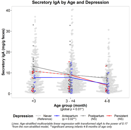 結果:在產(chǎn)前和持續(xù)抑郁的母親中,嬰兒糞便中的sIgA濃度非常低(6%女性和2%女性)。 與糞便取樣時的母乳喂養(yǎng)狀況、嬰兒抗生素暴露或其他協(xié)變量無關,孕婦產(chǎn)前抑郁癥狀與嬰兒平均sIgA濃度降低(β=-0.07,p<0.01)相關。sIgA的降低會對較大的嬰兒(4至8個月)產(chǎn)生很大的影響—無論是否母乳喂養(yǎng)。沒有發(fā)現(xiàn)嬰兒sIgA降低與產(chǎn)后抑郁癥狀(7%女性)或任何可察覺的壓力情況相關。