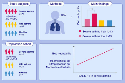 Results: Severe asthma patients with high BAL IL-13, despite treatment with high-dose inhaled corticosteroids, had more severe lung function and significantly higher BAL neutrophil percentages, but not BAL eosinophils than those with normal BAL-13 concentrations. This finding was replicated in the second cohort, which further associated BAL IL-13 and neutrophilia with a greater abundance of potentially pathogenic bacteria in the peripheral airways.
