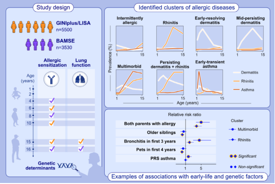 方法:使用縱向k均值聚類推導(dǎo)兩個(gè)德國出生隊(duì)列(GINIplus/LISA)中過敏性疾病(哮喘、特應(yīng)性皮炎和鼻炎)的軌跡。通過多項(xiàng)模型估計(jì)了與早期生活決定因素、多基因風(fēng)險(xiǎn)評(píng)分、食物和空氣過敏原致敏以及肺功能的相關(guān)性。這些結(jié)果在獨(dú)立的瑞典BAMSE隊(duì)列中得到了重復(fù)。
